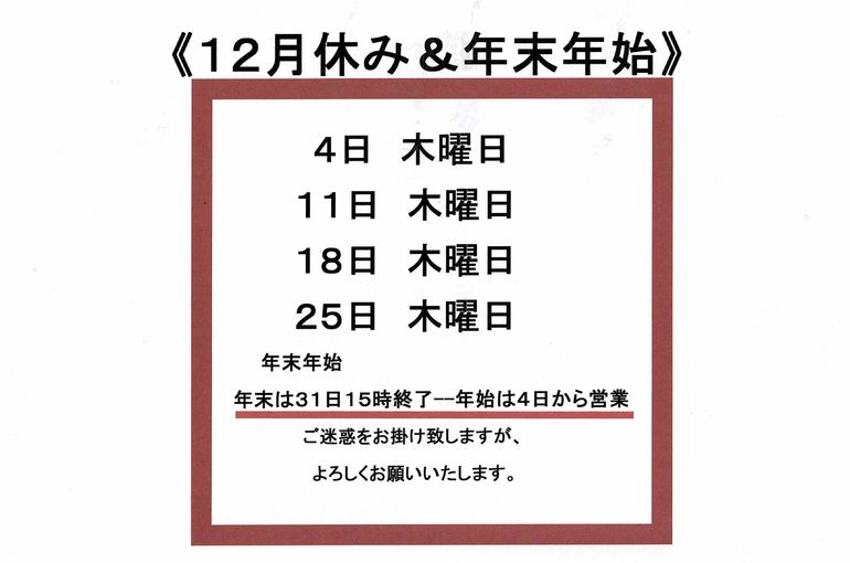 12月の定休日をお知らせいたします。季節柄ご多忙の折ではございますが、早めのご予約をお勧め致します。